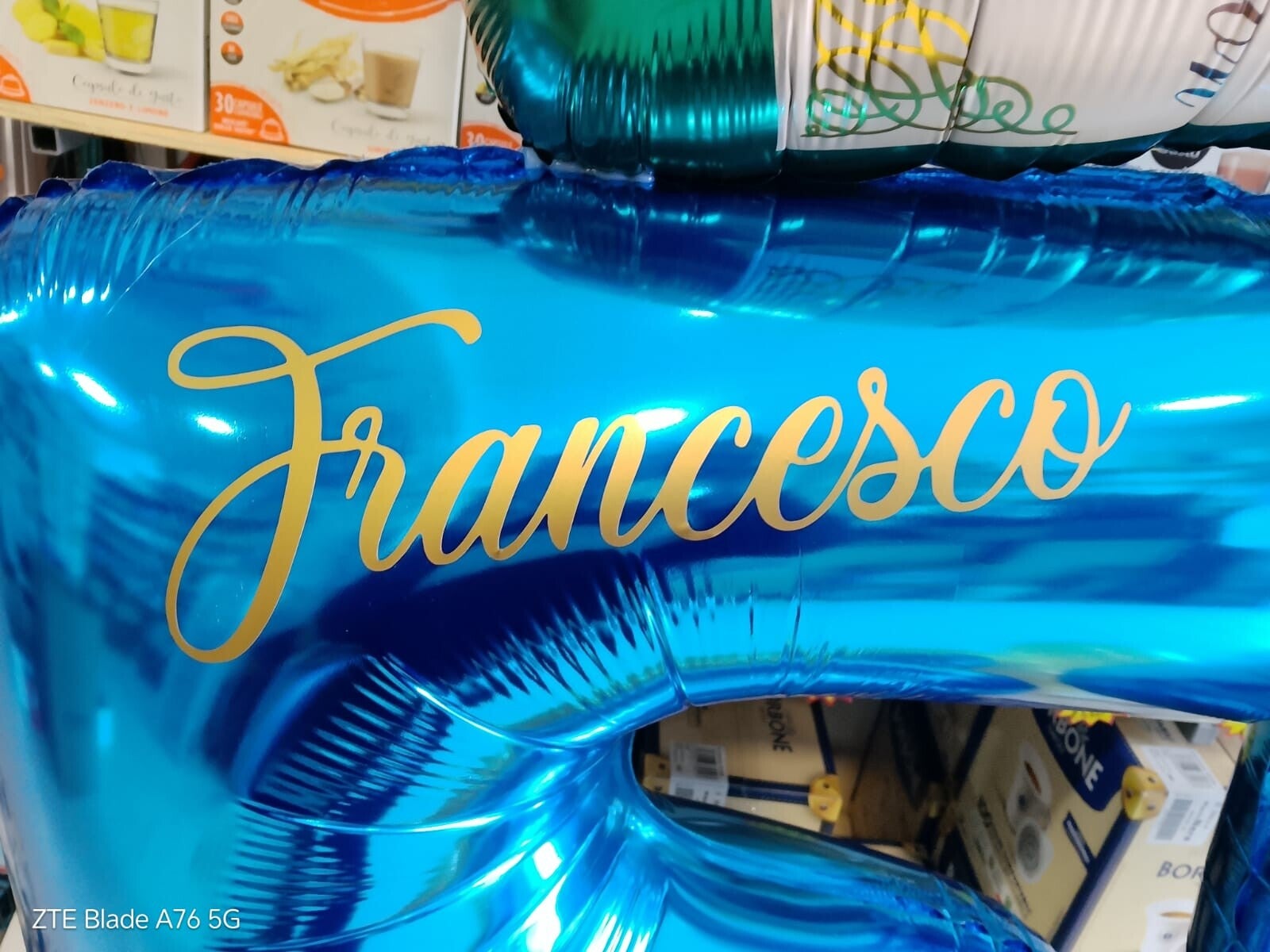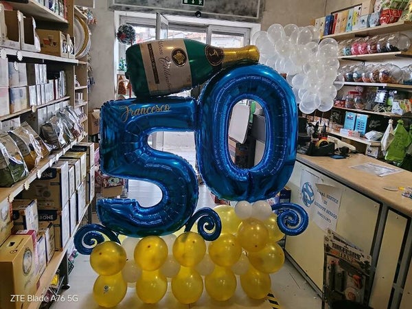 COMPOSIZIONE PALLONCINI 50 ANNI, CON NOME E BOTTIGLIA